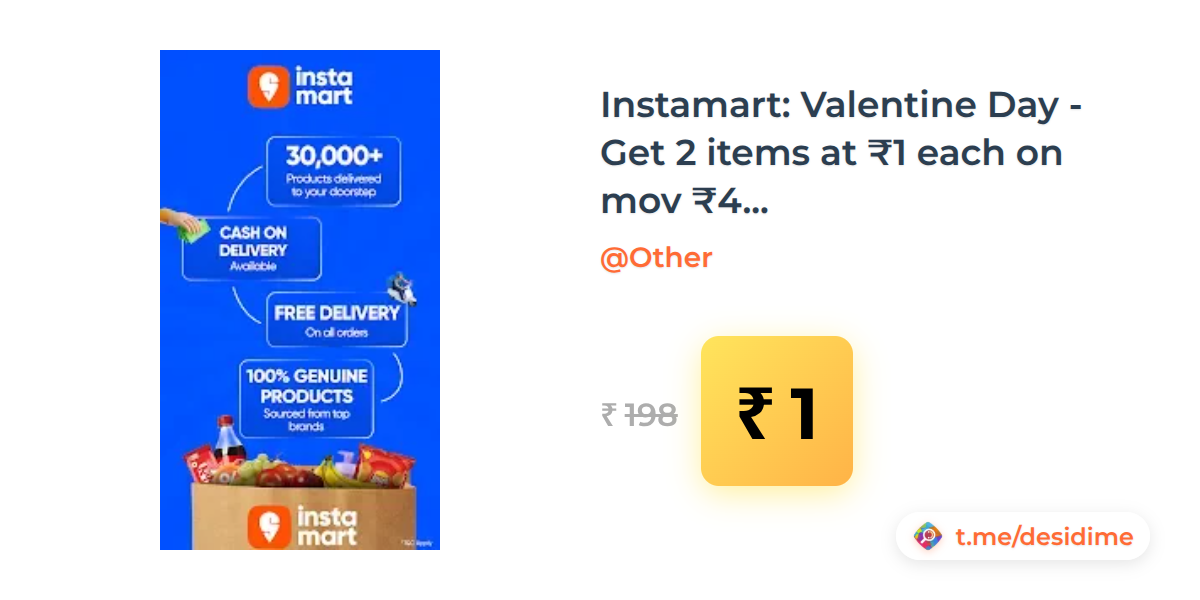 99% off on - Instamart: Valentine Day - Get 2 items at ₹1 each on mov ₹49 (account specific) - Rs. 1