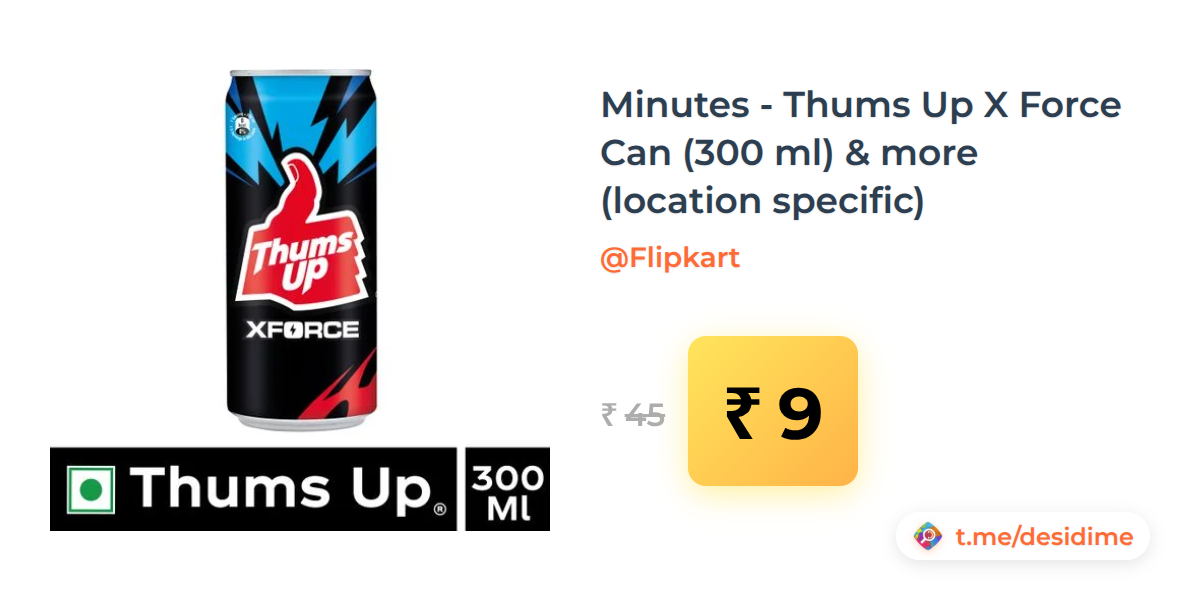 80% off on - Minutes - Thums Up X Force Can (300 ml) & more (location specific) - Rs. 9