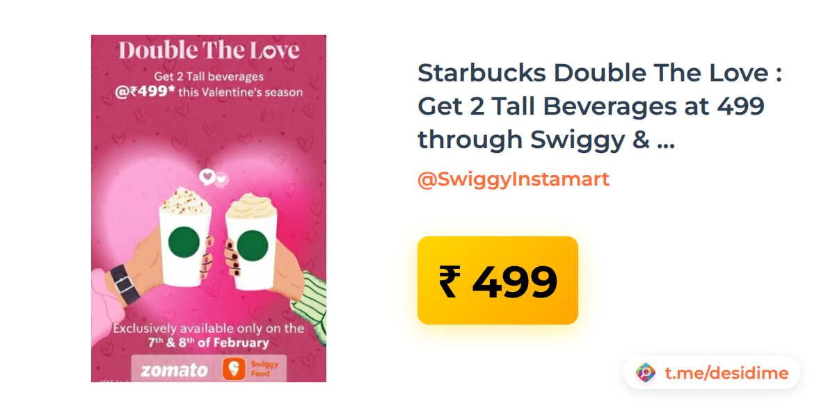 Starbucks Double The Love : Get 2 Tall Beverages at 499 through Swiggy & Zomato (8th Feb) - Rs. 499