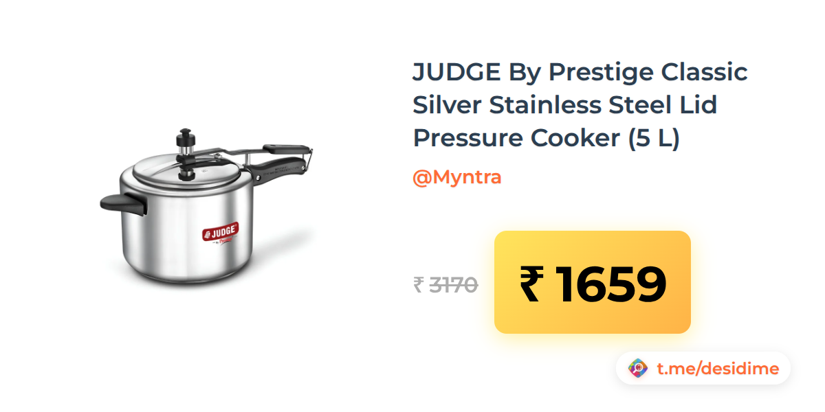 48% off on - JUDGE By Prestige Classic Silver Stainless Steel Lid Pressure Cooker (5 L) - Rs. 1659