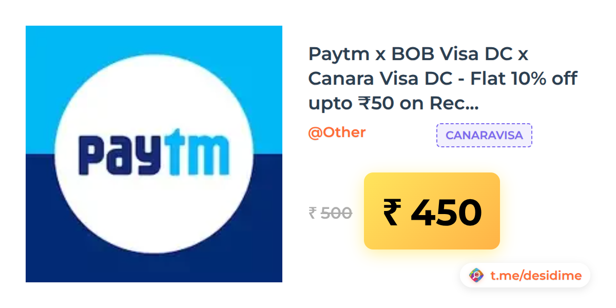 10% off on - Paytm x BOB Visa DC x Canara Visa DC - Flat 10% off upto ₹50 on Recharge & Bill Payments - Rs. 450