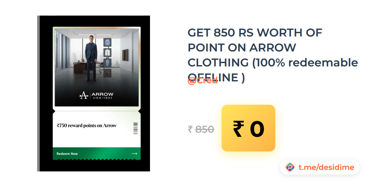 100% off on - GET 850 RS WORTH OF POINT ON ARROW CLOTHING (100% redeemable OFFLINE ) - Rs. 0