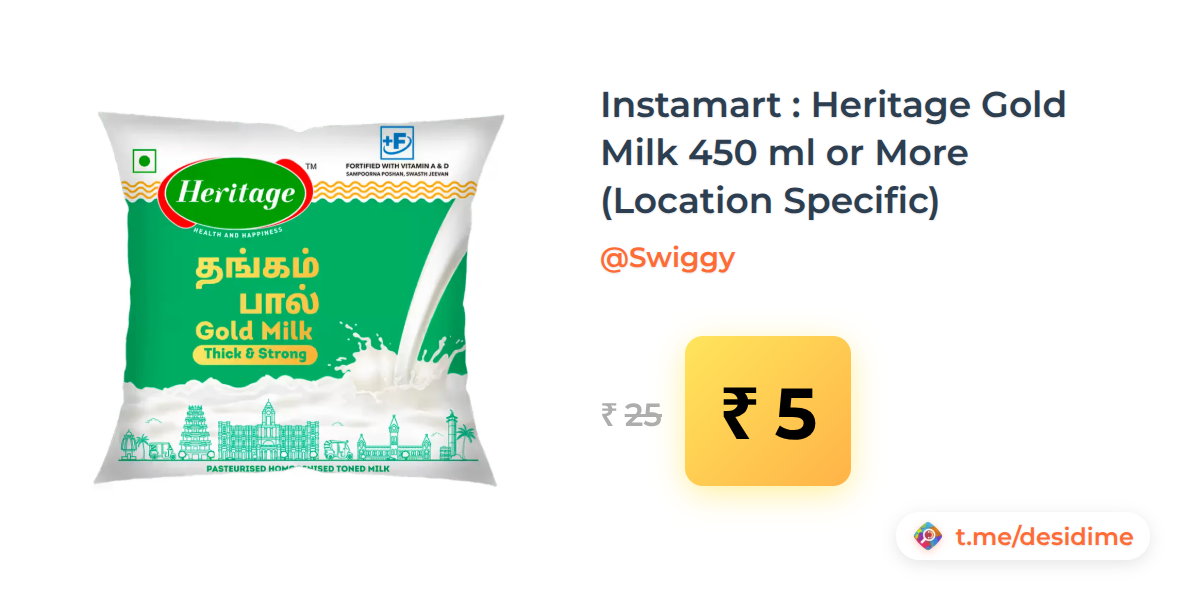 80% off on - Instamart : Heritage Gold Milk 450 ml or More (Location Specific) - Rs. 5