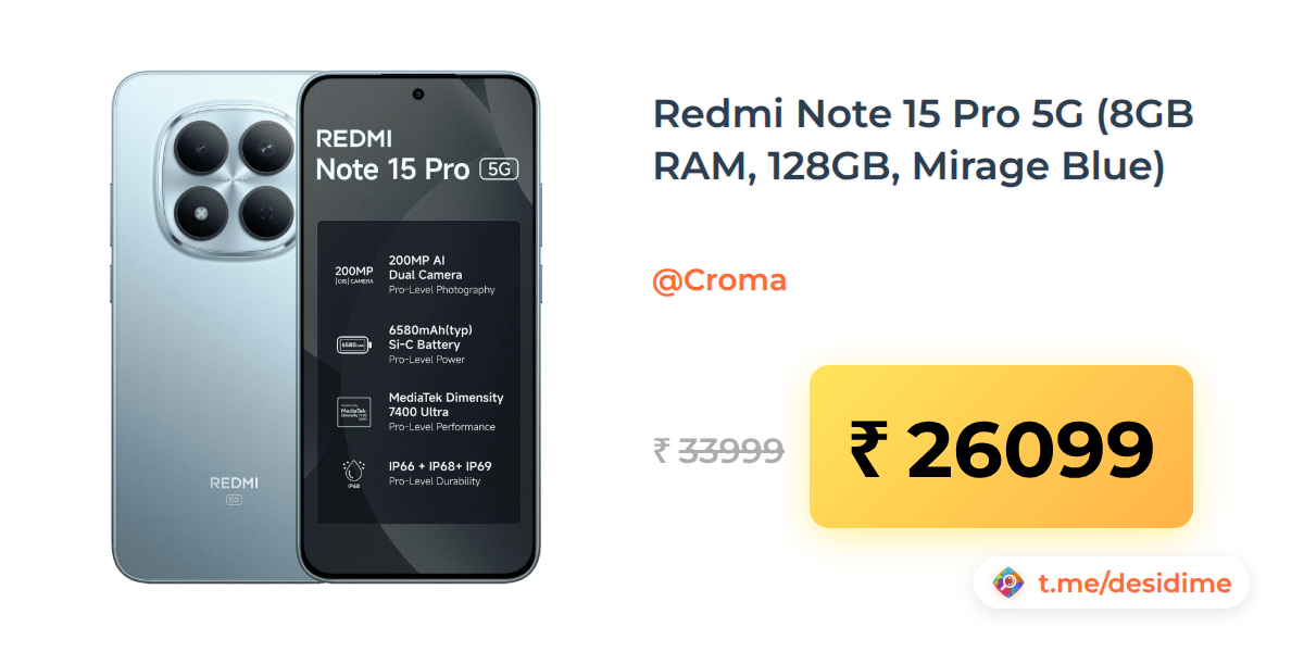 23% off on - Redmi Note 15 Pro 5G (8GB RAM, 128GB, Mirage Blue) - Rs. 26099