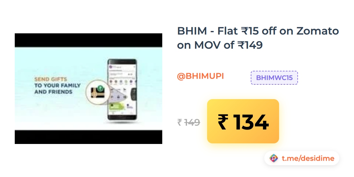 10% off on - BHIM - Flat ₹15 off on Zomato on MOV of ₹149 - Rs. 134