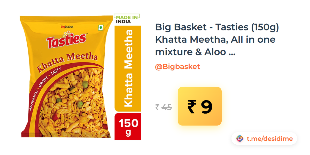 80% off on - Big Basket - Tasties (150g) Khatta Meetha, All in one mixture & Aloo bhujia at ₹9 - Rs. 9