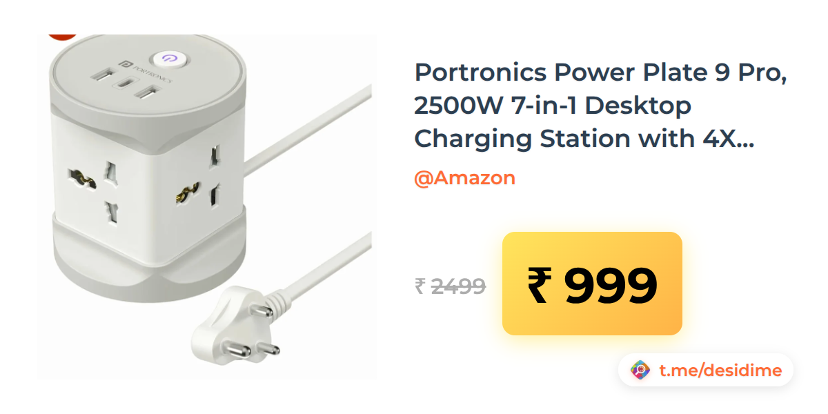 60% off on - Portronics Power Plate 9 Pro, 2500W 7-in-1 Desktop Charging Station with 4X Universal Sockets, 12W USB-A & Type-C Ports, Space-Saving Power Extender, 2M Cord, Power Switch, Child Proof Shutters - Rs. 999