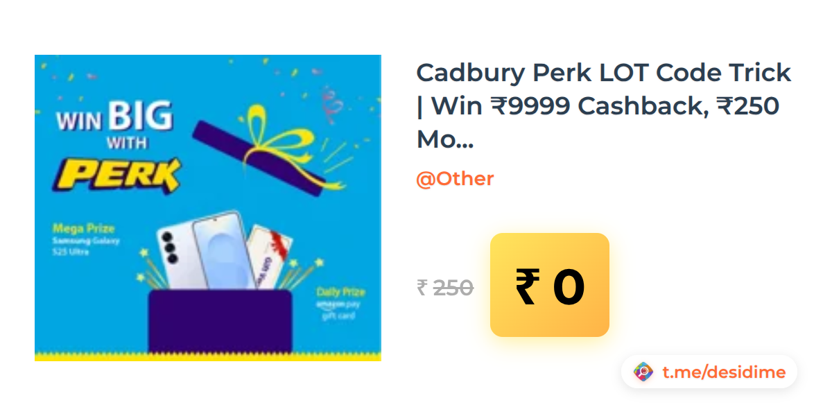100% off on - Cadbury Perk LOT Code Trick | Win ₹9999 Cashback, ₹250 Movie Voucher, ₹10 & ₹5 Cashback - Rs. 0