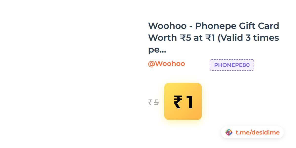 80% off on - Woohoo - Phonepe Gift Card Worth ₹5 at ₹1 (Valid 3 times per customer) - Rs. 1
