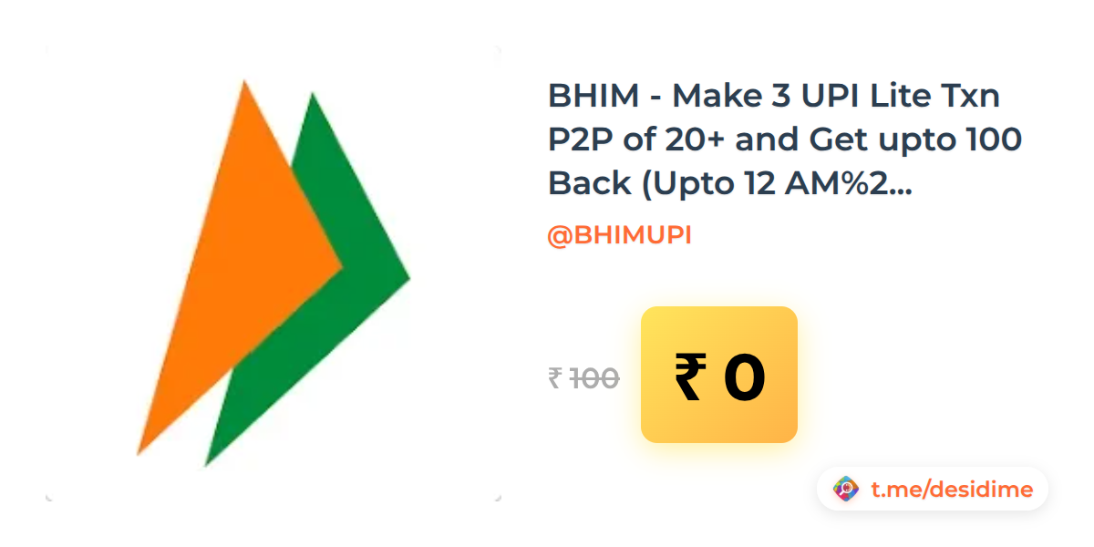 100% off on - BHIM - Make 3 UPI Lite Txn P2P of 20+ and Get upto 100 Back (Upto 12 AM) (20 March 2026) - Rs. 0