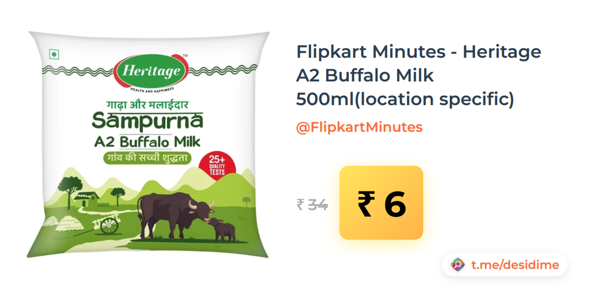 82% off on - Flipkart Minutes - Heritage A2 Buffalo Milk 500ml(location specific) - Rs. 6