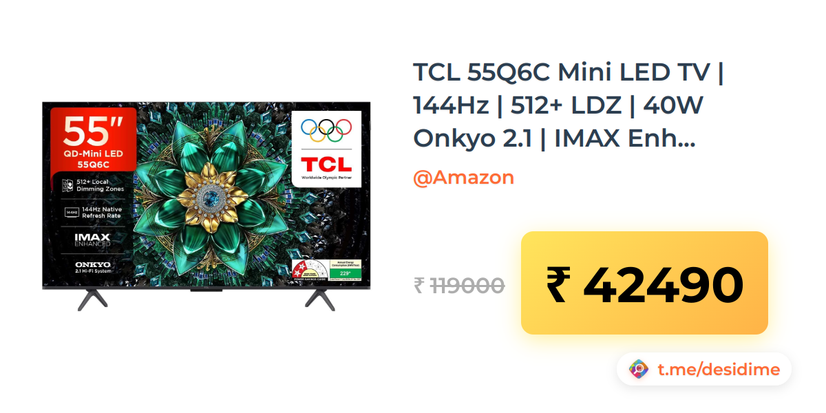 64% off on - TCL 55Q6C Mini LED TV | 144Hz | 512+ LDZ | 40W Onkyo 2.1 | IMAX Enhanced | AMD Freesync Premium Pro - Rs. 42490