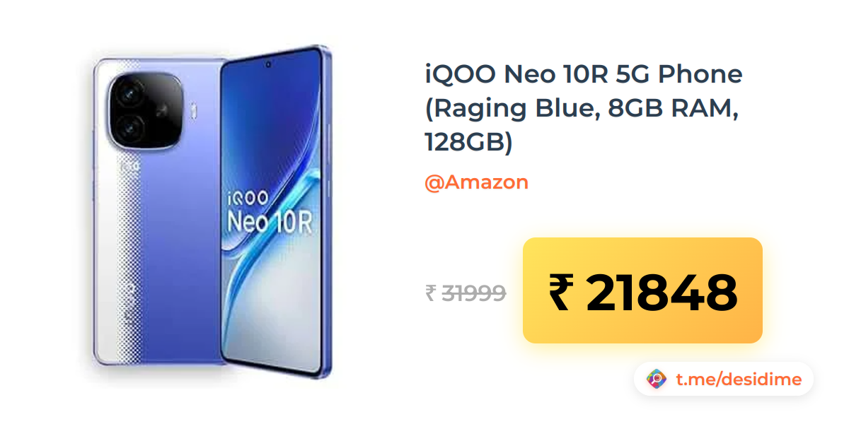 32% off on - iQOO Neo 10R 5G Phone (Raging Blue, 8GB RAM, 128GB) - Rs. 21848