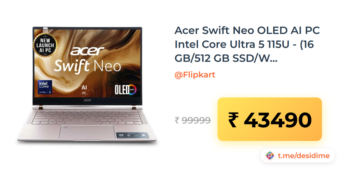 57% off on - Acer Swift Neo OLED AI PC Intel Core Ultra 5 115U - (16 GB/512 GB SSD/Windows 11 Home) SFN14-54H Thin and Light Laptop - Rs. 43490