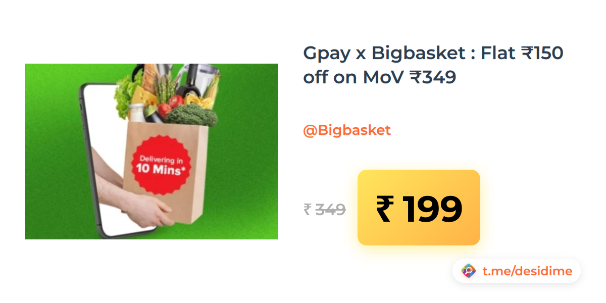 43% off on - Gpay x Bigbasket : Flat ₹150 off on MoV ₹349 - Rs. 199