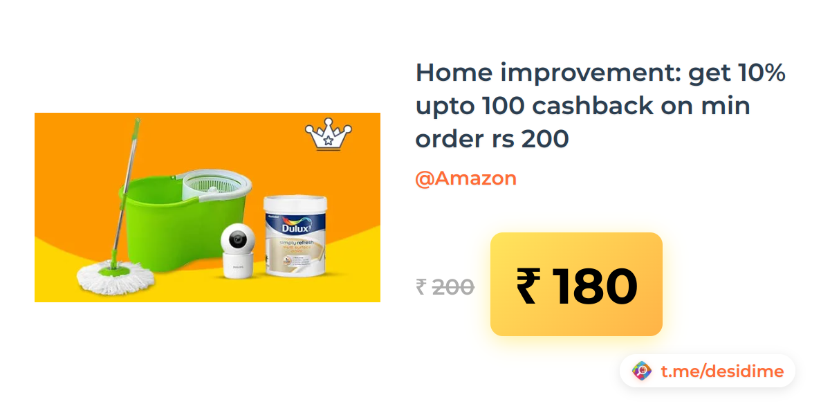 10% off on - Home improvement: get 10% upto 100 cashback on min order rs 200 - Rs. 180