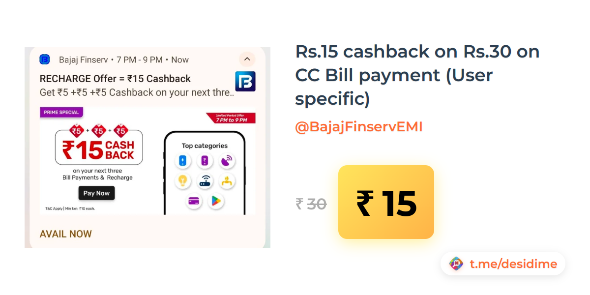 50% off on - Rs.15 cashback on Rs.30 on CC Bill payment (User specific) - Rs. 15