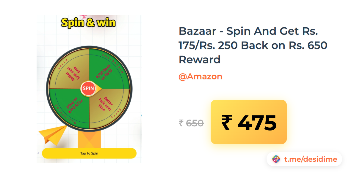 27% off on - Bazaar - Spin And Get Rs. 175/Rs. 250 Back on Rs. 650 Reward - Rs. 475