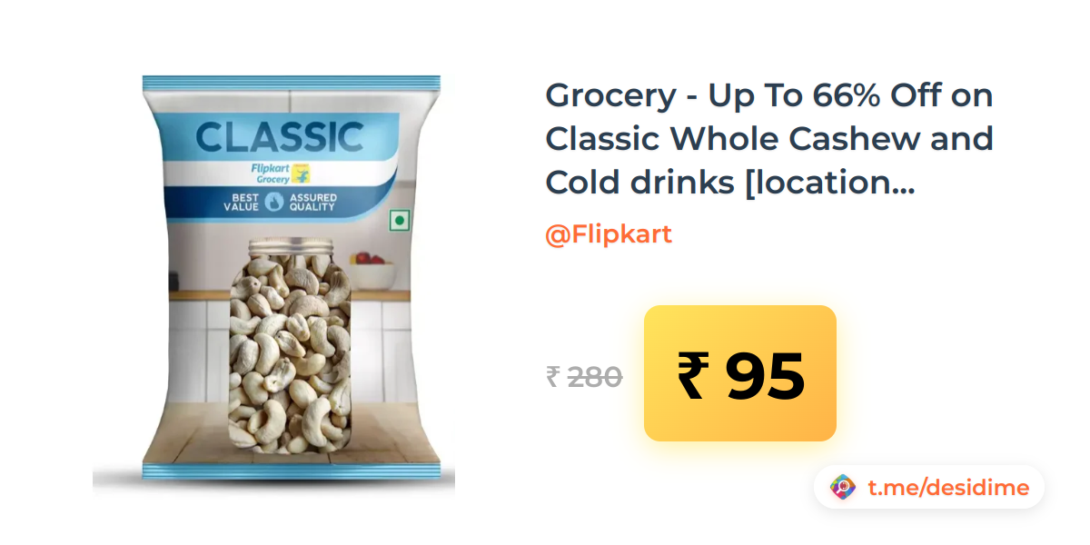 66% off on - Grocery - Up To 66% Off on Classic Whole Cashew and Cold drinks [location specific] - Rs. 95