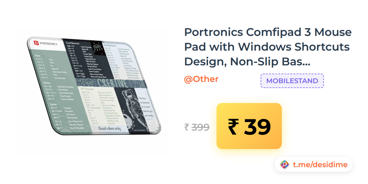 90% off on - Portronics Comfipad 3 Mouse Pad with Windows Shortcuts Design, Non-Slip Base, Stitched Edges, High-Precision Smooth Surface, Water Resistant Keyboard Pad for Gaming, Office & Home (Grey) - Rs. 39