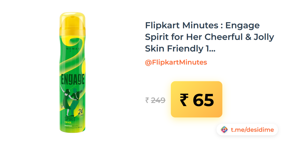 74% off on - Flipkart Minutes : Engage Spirit for Her Cheerful & Jolly Skin Friendly 150ml Deodorant Spray - For Women (150 ml) - Rs. 65
