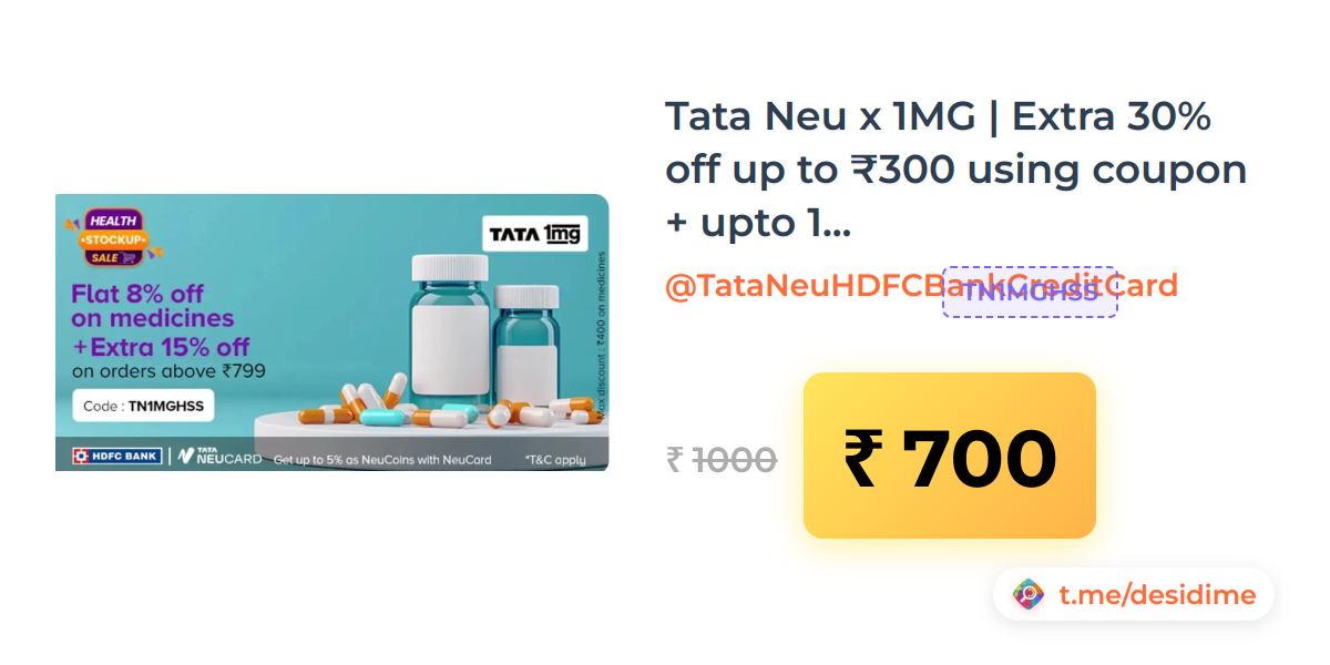 30% off on - Tata Neu x 1MG | Extra 30% off up to ₹300 using coupon + upto 10% NC on Tata HDFC Cards - Rs. 700