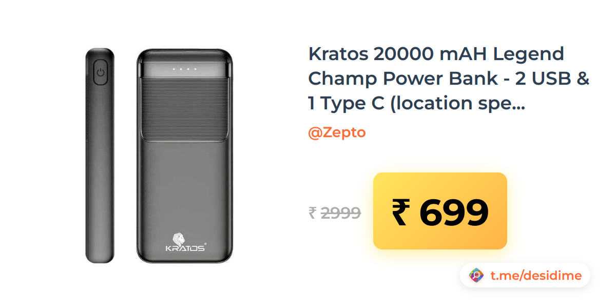 77% off on - Kratos 20000 mAH Legend Champ Power Bank - 2 USB & 1 Type C (location specific) - Rs. 699
