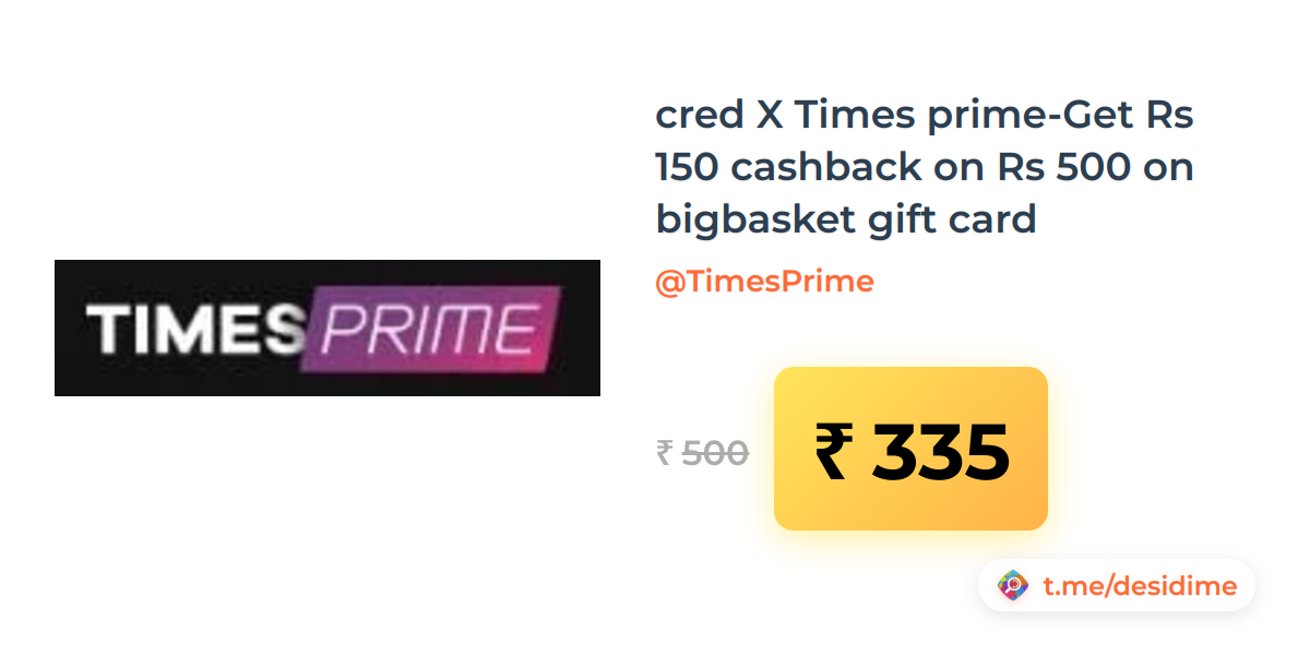 33% off on - cred X Times prime-Get Rs 150 cashback on Rs 500 on bigbasket gift card - Rs. 335