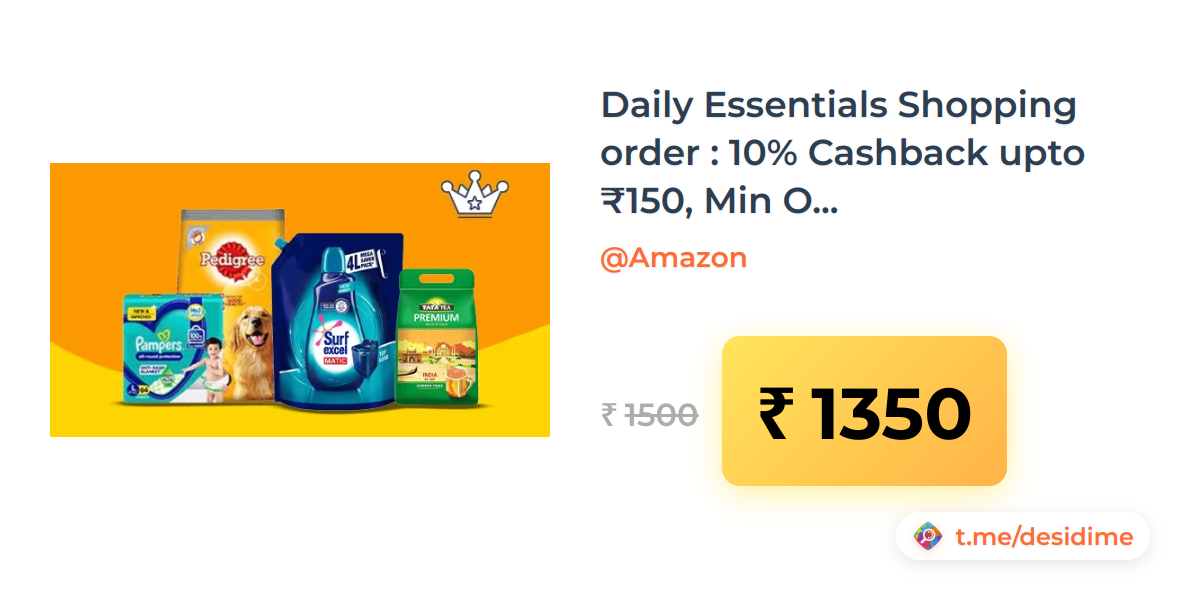 10% off on - Daily Essentials Shopping order : 10% Cashback upto โน150, Min Order โน1500 - Rs. 1350