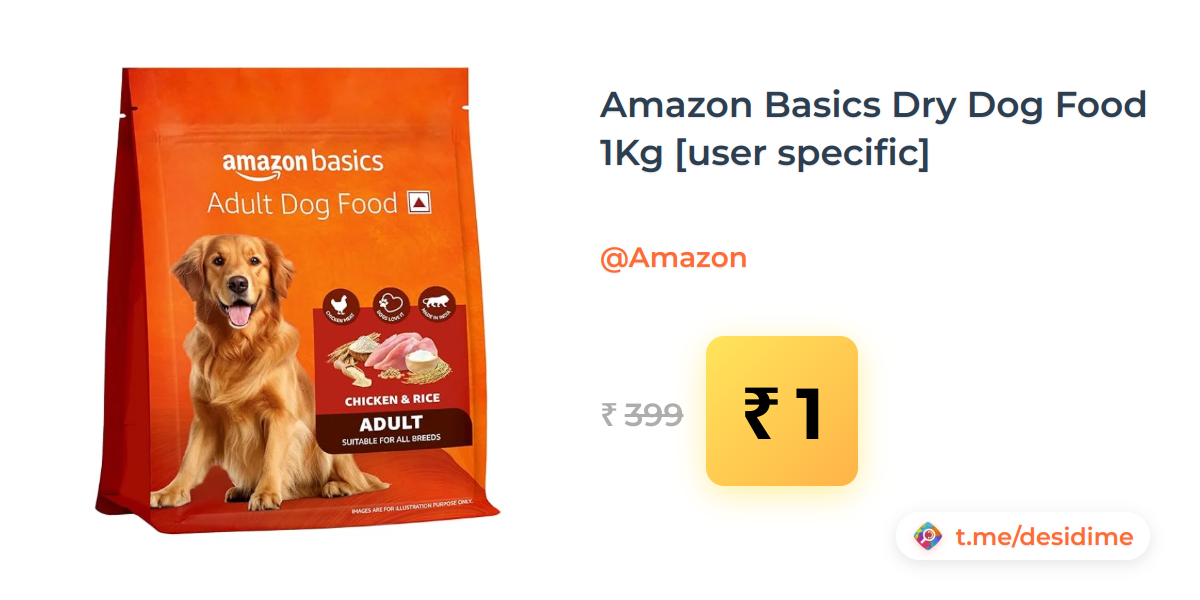 100% off on - Amazon Basics Dry Dog Food 1Kg [user specific] - Rs. 1