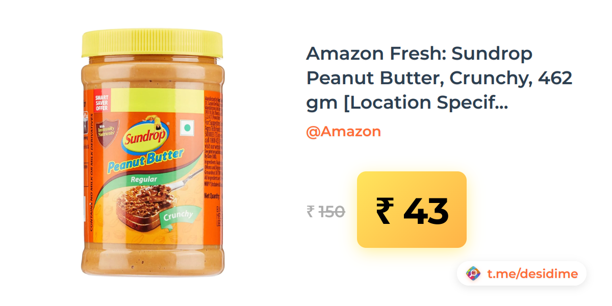 71% off on - Amazon Fresh: Sundrop Peanut Butter, Crunchy, 462 gm [Location Specific] - Rs. 43