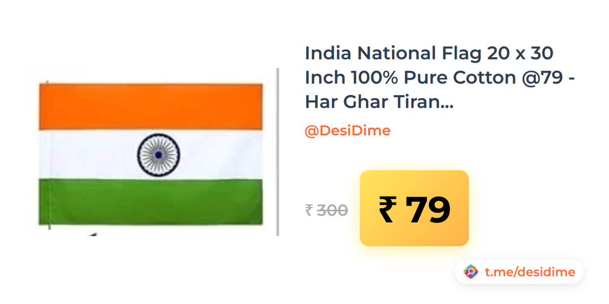 74% off on - India National Flag 20 x 30 Inch 100% Pure Cotton @79 -