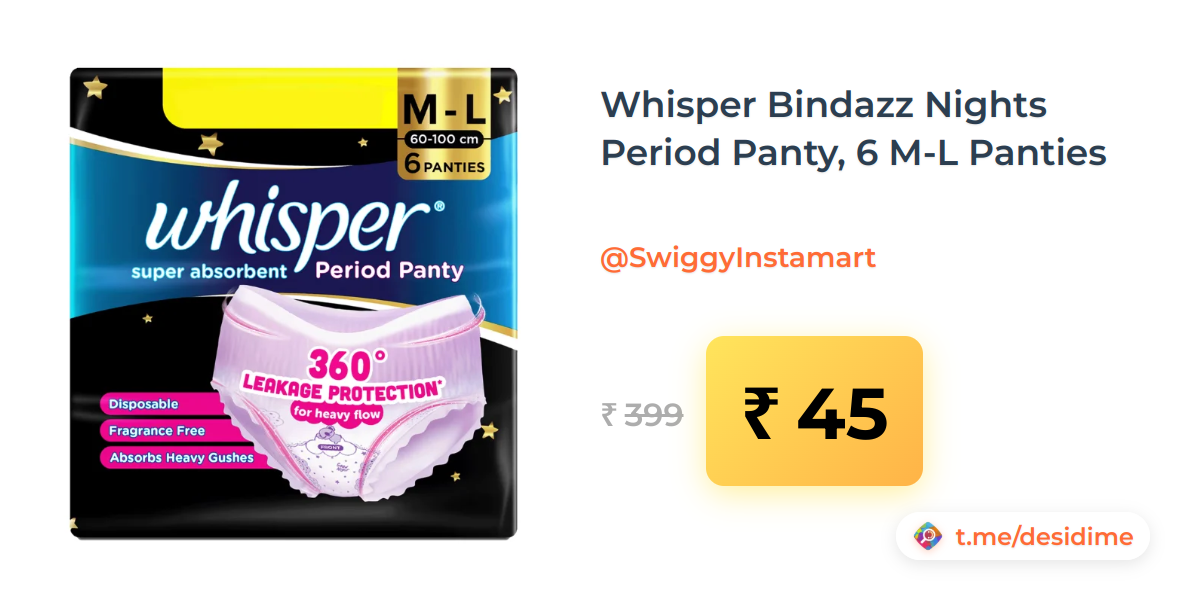 89% off on - Whisper Bindazz Nights Period Panty, 6 M-L Panties - Rs. 45