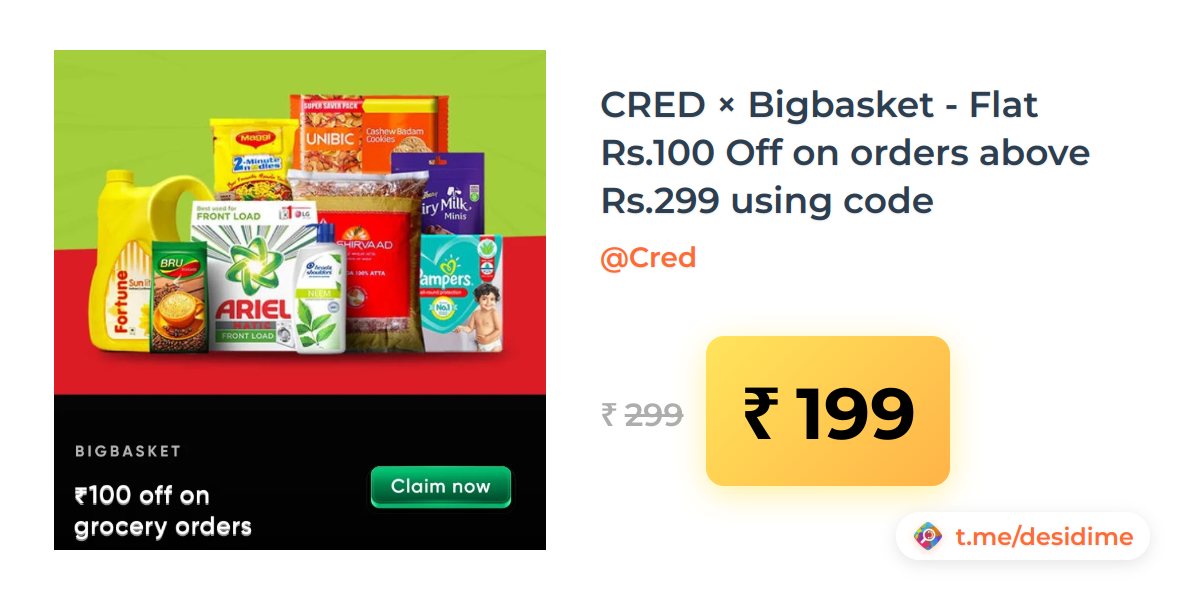33% off on - CRED × Bigbasket - Flat Rs.100 Off on orders above Rs.299 using code - Rs. 199