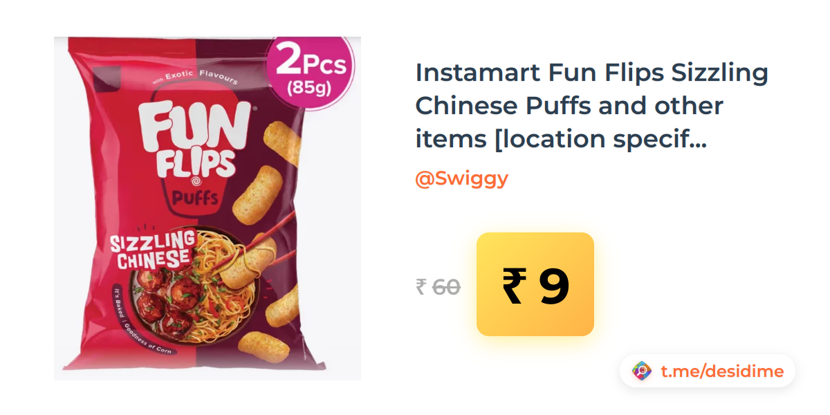 85% off on - Instamart Fun Flips Sizzling Chinese Puffs and other items [location specific] - Rs. 9