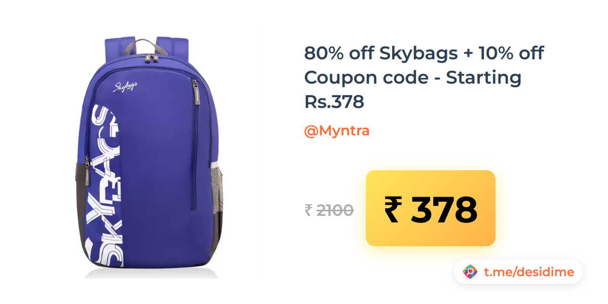 82% off on - 80% off Skybags + 10% off Coupon code - Starting Rs.378  - Rs. 378