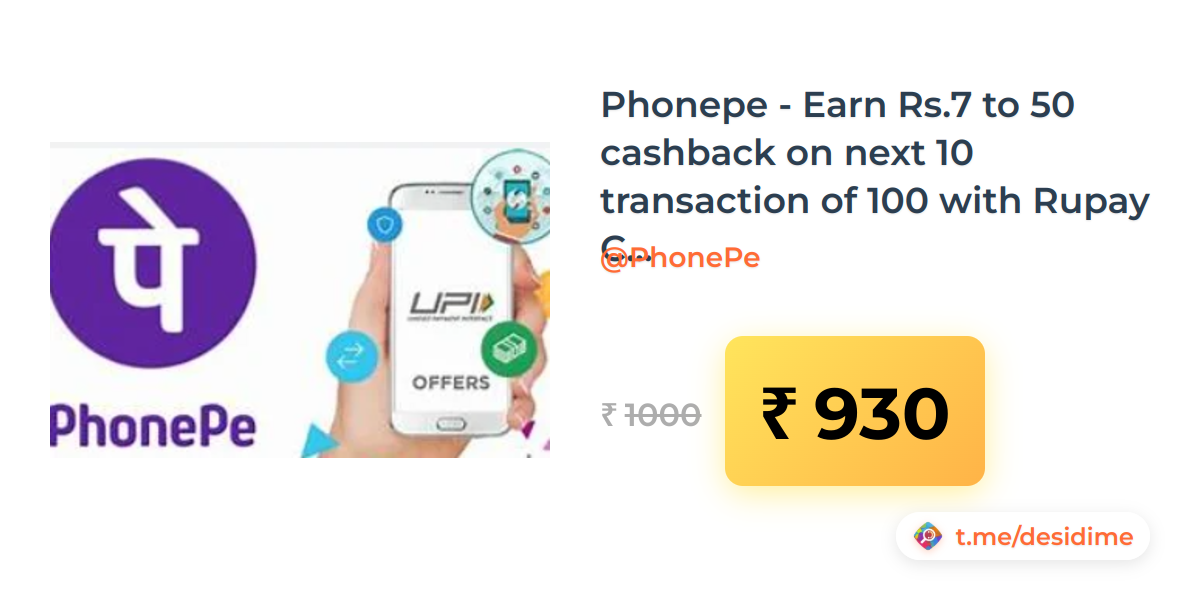 7% off on - Phonepe - Earn Rs.7 to 50 cashback on next 10 transaction of 100 with Rupay Credit Card on UPI - Rs. 930