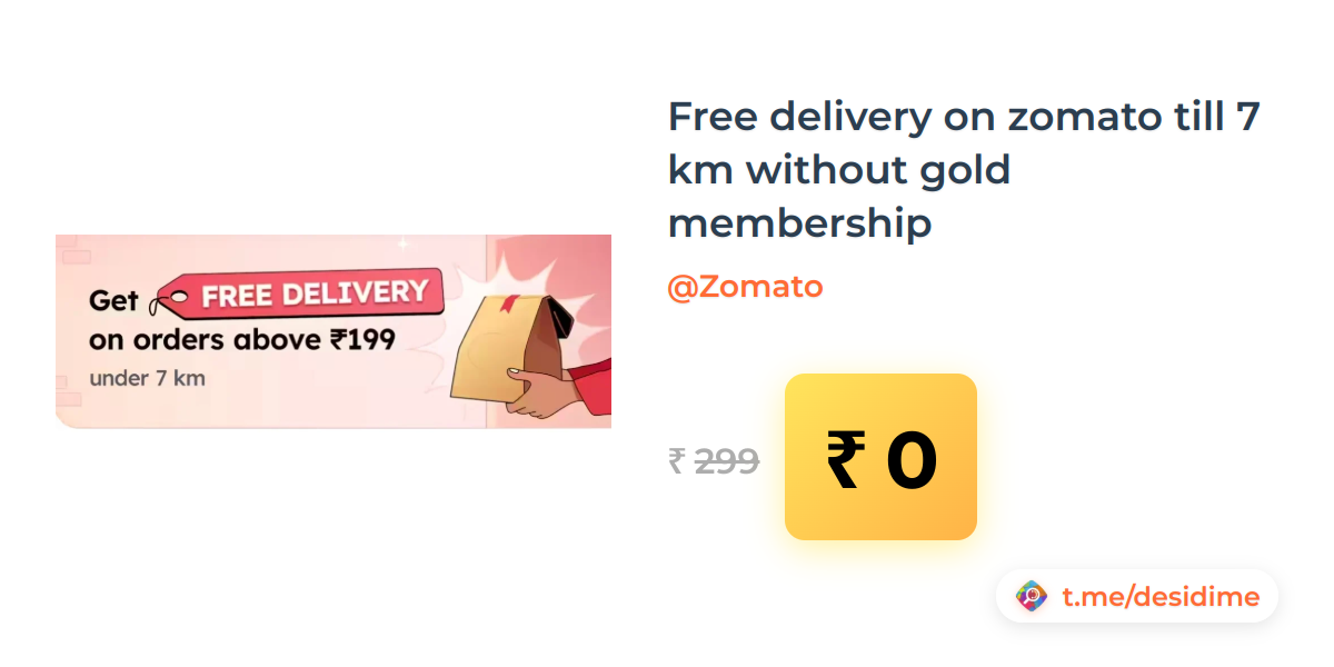 100% off on - Free delivery on zomato till 7 km without gold membership - Rs. 0