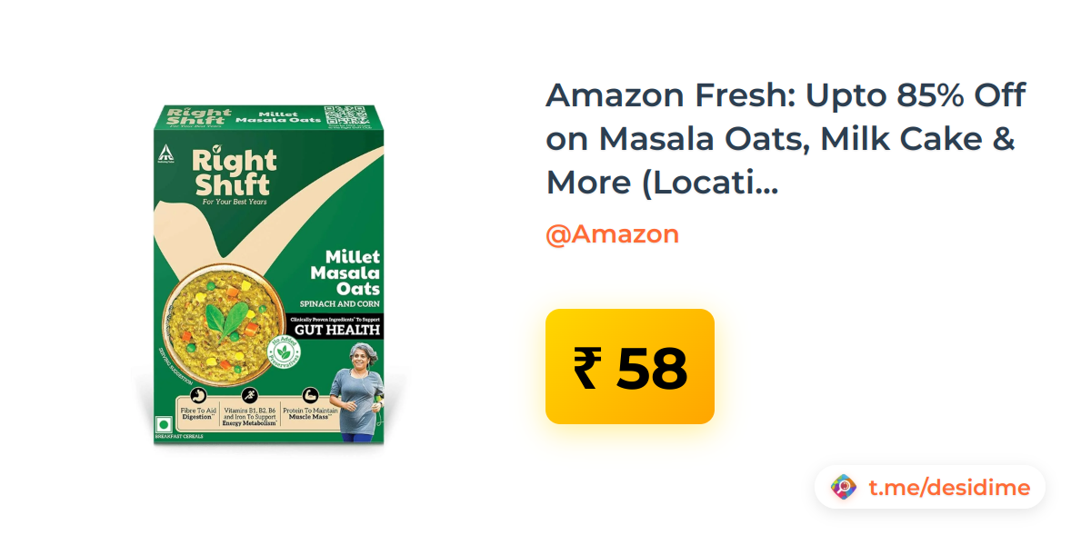 85% off on - Amazon Fresh: Upto 85% Off on Masala Oats, Milk Cake & More (Location Specific) - Rs. 58