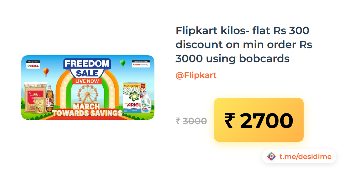 10% off on - Flipkart kilos- flat Rs 300 discount on min order Rs 3000 using bobcards - Rs. 2700