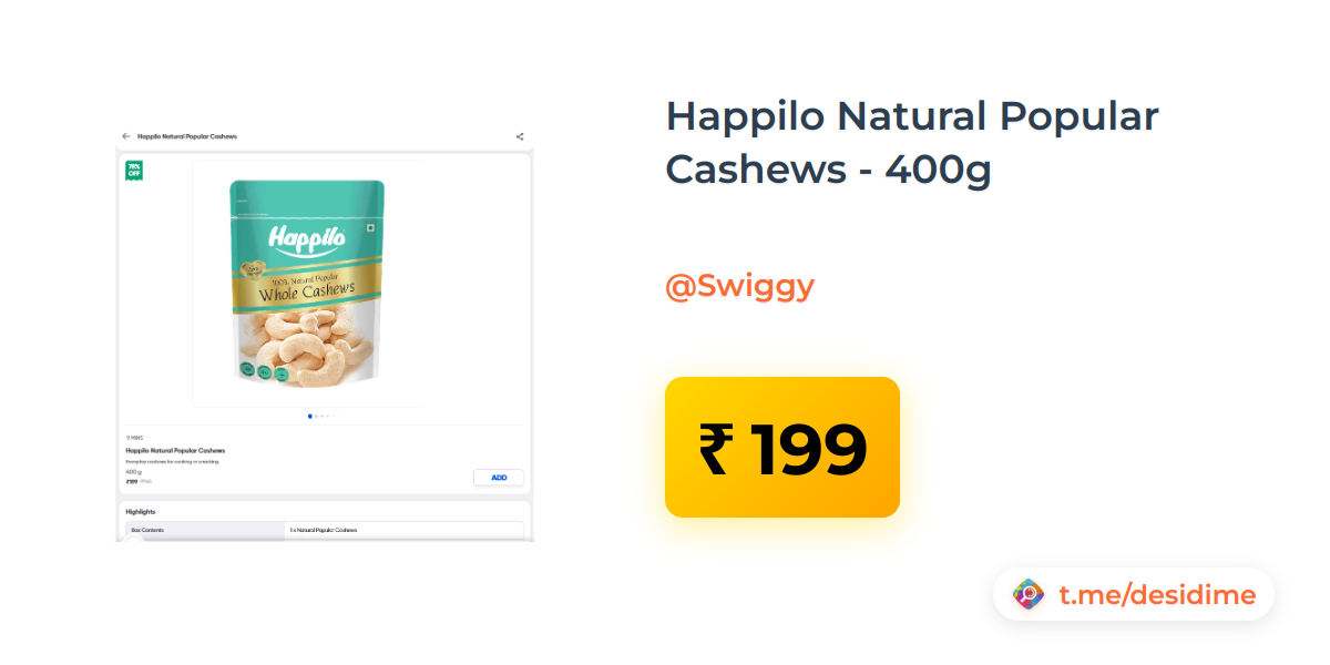 79% off on - Happilo Natural Popular Cashews - 400g - Rs. 199