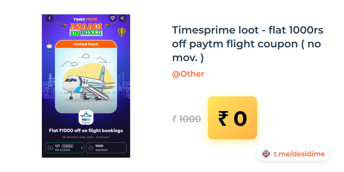 100% off on - Timesprime loot - flat 1000rs off paytm flight coupon ( no mov. ) - Rs. 0