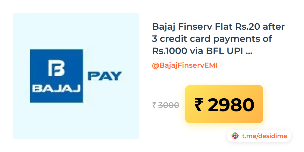 1% off on - Bajaj Finserv Flat Rs.20 after 3 credit card payments of Rs.1000 via BFL UPI (4pm - 7pm) - Rs. 2980