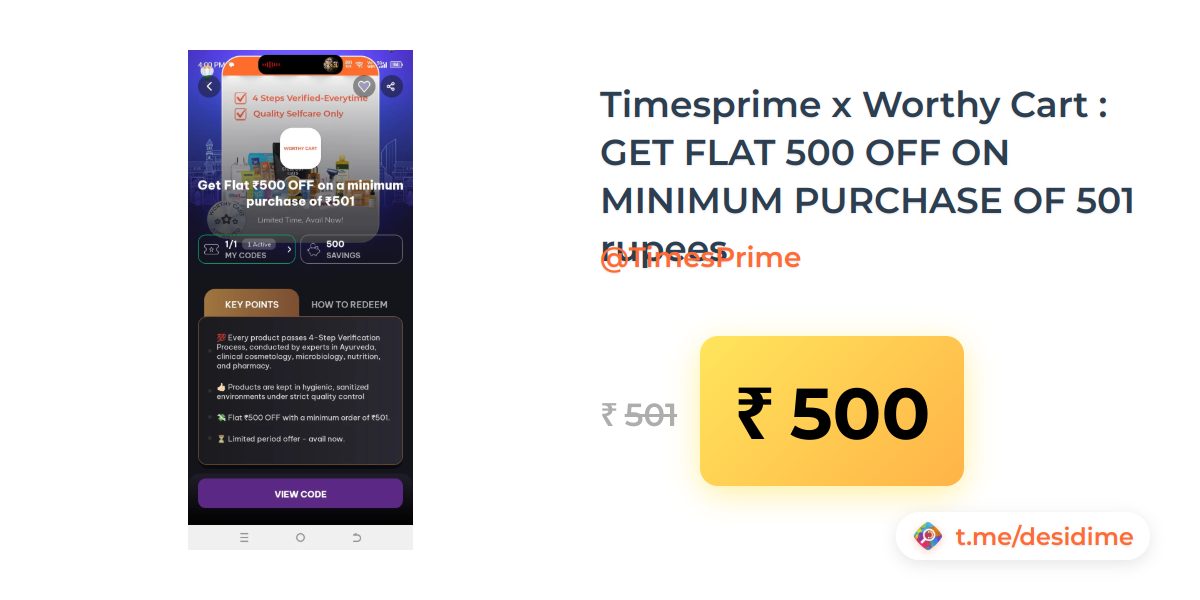 100% off on - Timesprime x Worthy Cart : GET FLAT 500 OFF ON MINIMUM PURCHASE OF 501 rupees - Rs. 500