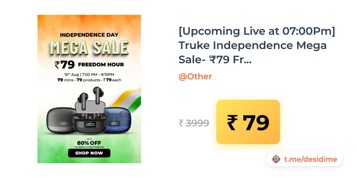 98% off on - [Upcoming Live at 07:00Pm] Truke Independence Mega Sale- ₹79 Freedom Hour Get TWS Earbuds at ₹79 for 79 Minutes - Rs. 79