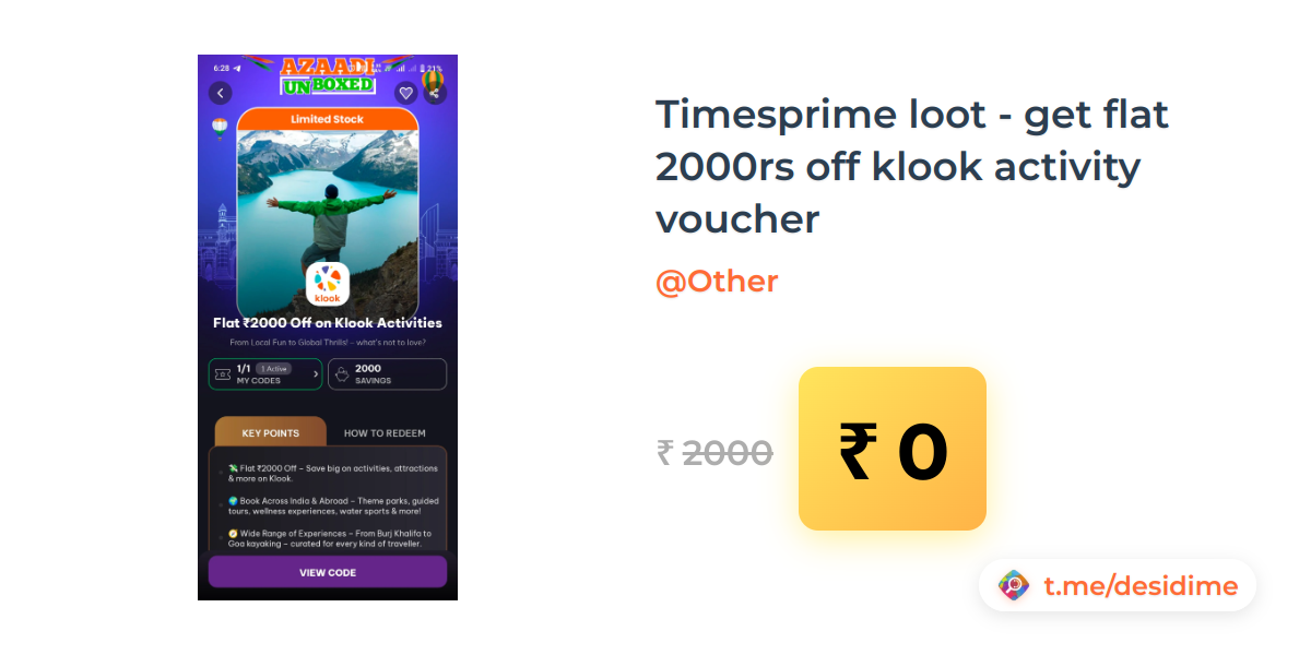 100% off on - Timesprime loot - get flat 2000rs off klook activity voucher - Rs. 0