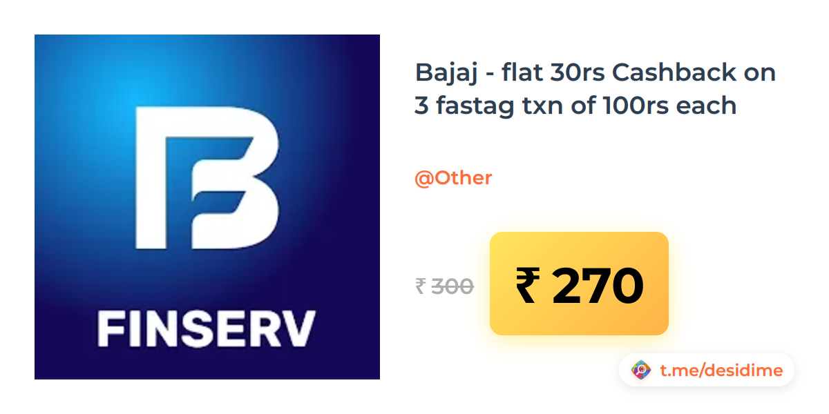 10% off on - Bajaj - flat 30rs Cashback on 3 fastag txn of 100rs each - Rs. 270