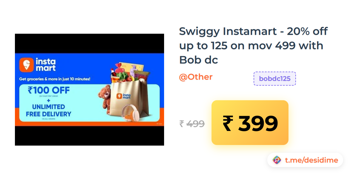20% off on - Swiggy Instamart - 20% off up to 125 on mov 499 with Bob dc - Rs. 399