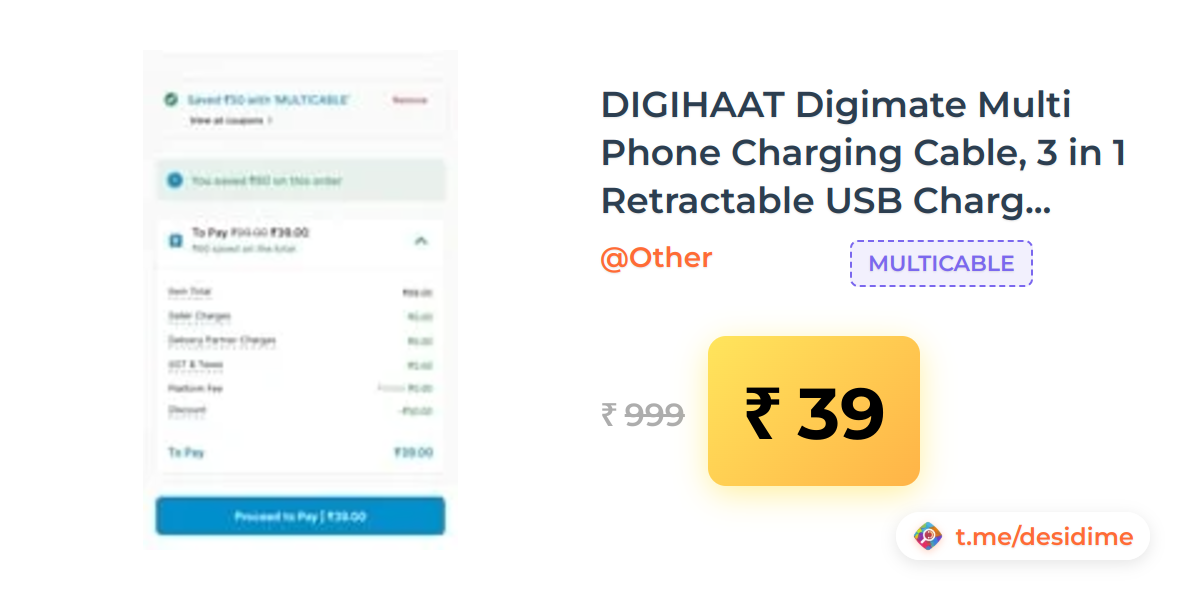 96% off on - DIGIHAAT Digimate Multi Phone Charging Cable, 3 in 1 Retractable USB Charger Cable, Charging Cable Adapter with Type-C, Micro USB Port Compatible with Cell Phone Tablets (Green) - Rs. 39