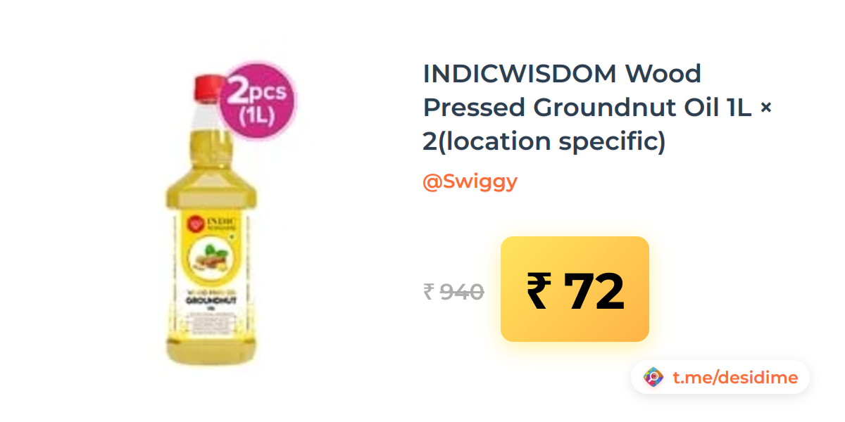92% off on - INDICWISDOM Wood Pressed Groundnut Oil 1L × 2(location specific) - Rs. 72